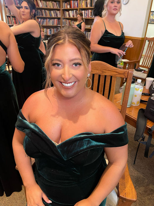 Full airbrush makeup and on-site wedding day application for members of your bridal party. This service includes full base makeup with or without faux lashes. This includes skincare prep, full base routine, highlight/contour, eyeshadow (choice of shimmer/glitter if desired), lashes, liner, and lip.